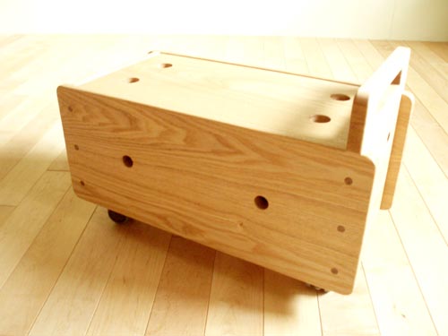 箱にはタイヤが4つ。蓋が付いてあります。こどもがまたいで乗って車に。