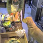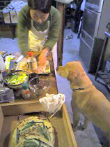 我が家のジズーもおいしそうな匂いにくぎったけ。普段ありつけないお肉の切れ端をもらえてご機嫌の模様。
