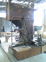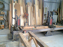 奥に木材を縦に切る、大きな帯ノコ盤。バンドソーとも言います。
